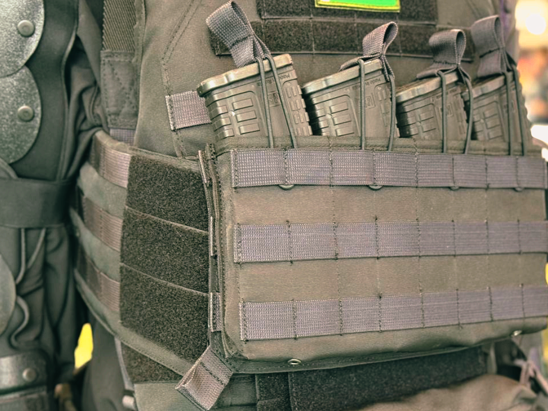 Ременно-плечевая система. Пояс овальной формы с сужением на концах и расширением в середине для удобства ношения. С боков есть три ряда секций Molle, а на передних частях пояса – ячейки для ременной ленты 40 мм для крепления кобуры. Тыльная сторона имеет карман для мягкого баллистического пакета, закрывающийся на контактную ленту. Внутри вставлена жесткая пена 8 мм для дополнительной жесткости.